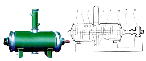 具有結構簡單,操作方便,使用周期長,性能穩(wěn)定可靠,蒸汽耗量小,適用性能強,產品質量好,適用于不耐高溫、易燃、調溫下易氧化的膏狀物料的干燥,該機經用戶長期使用證明是一良好的干燥設備。原理:被干燥物料從殼體上方正中間加入,在不斷正反轉動的耙齒的攪拌下,物料軸向來回走動,與殼體內壁接觸的表面不斷新,受到蒸汽的間接加熱,耙齒的均勻攪拌,粉碎棒的粉碎,使物料表面水分有利的排出,氣化的水分經干式除塵器、濕式除塵器、冷凝器,從真空泵出口處放空。結構:真空耙式干燥機的主要部件。